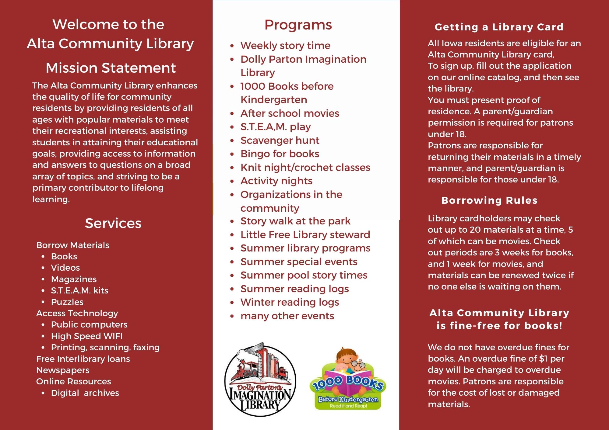 Then, in 1991, the library was moved to the Community Center. This move was facilitated by contributions from an anonymous donor. In 2003, the public library moved again, this time merging with the school library to create the Alta Community Library. This merge was made possible by a contribution from long-time Alta resident Addie Peterson. Since then, a 28E agreement has been established so both the school and the library have equal legal responsibilities.