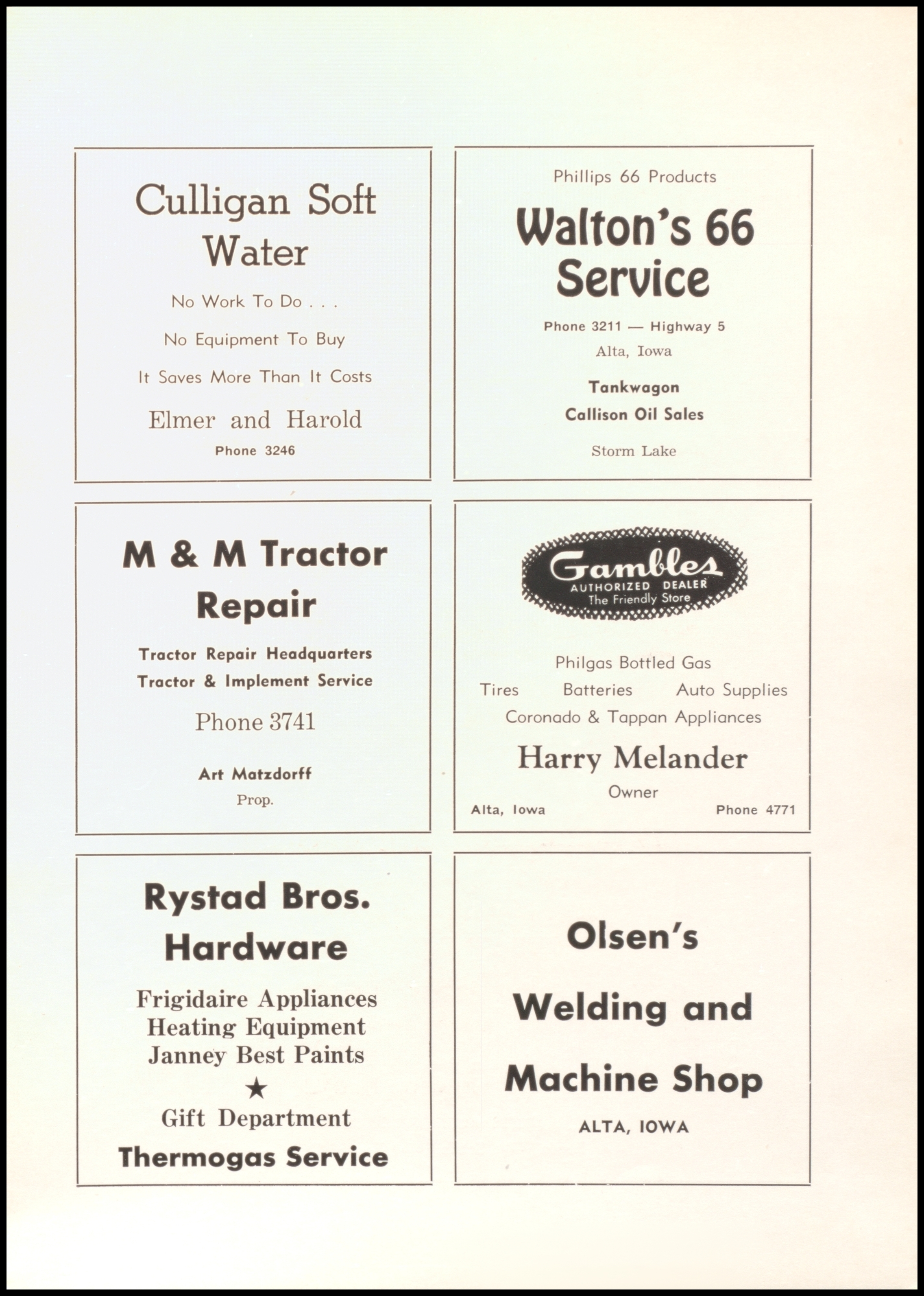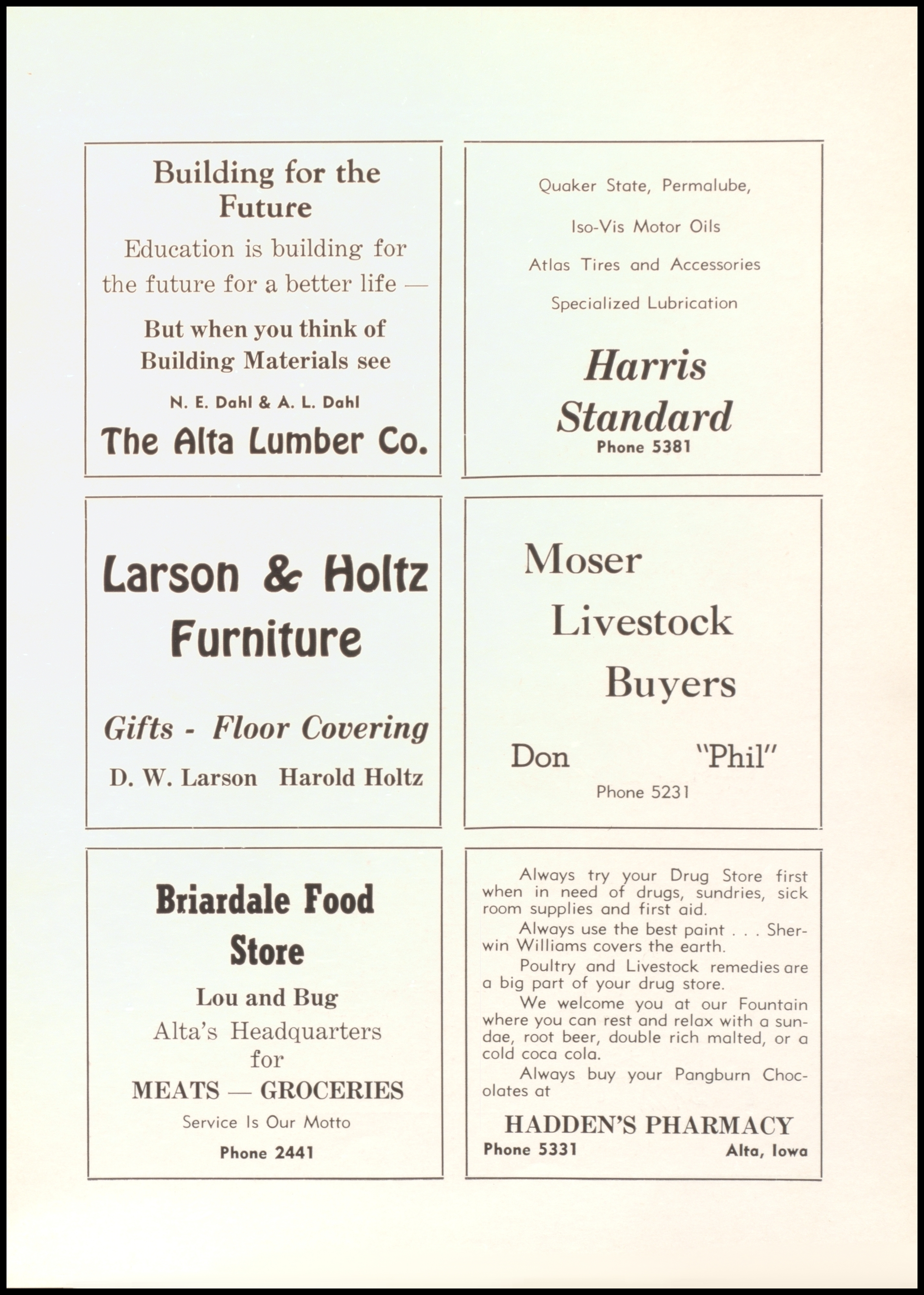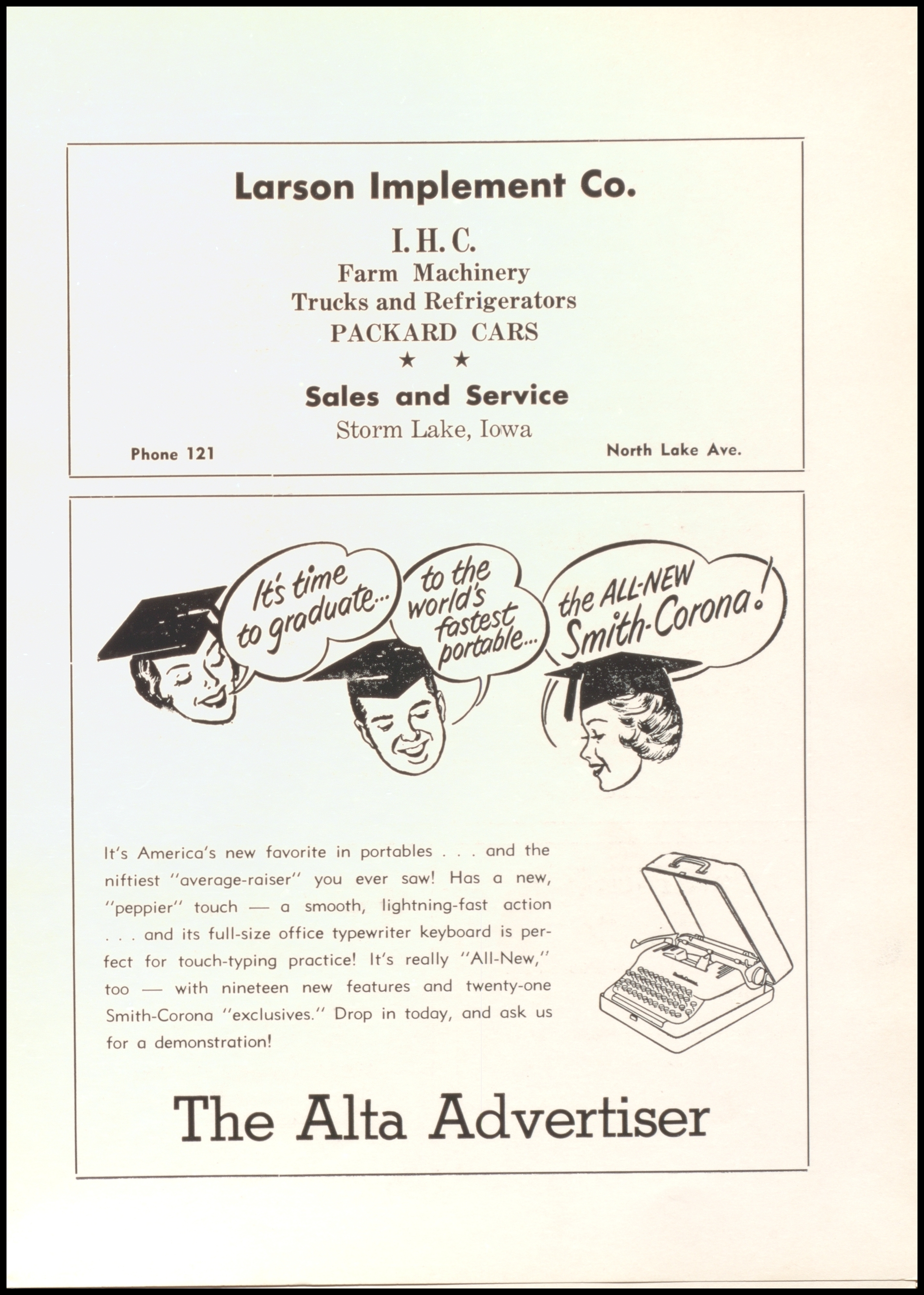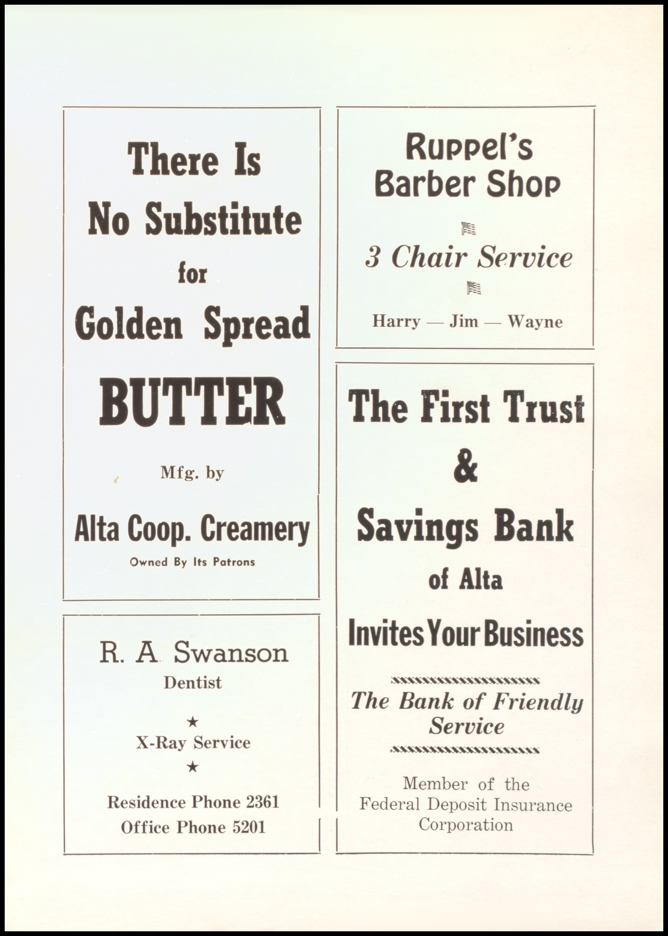 Below are digitized records, available for perusal. Please note that 1946 is not available in digital form, but is available at the Alta Community Library. This section is a work in progress. If you have any questions about yearbooks, feel free to contact us!