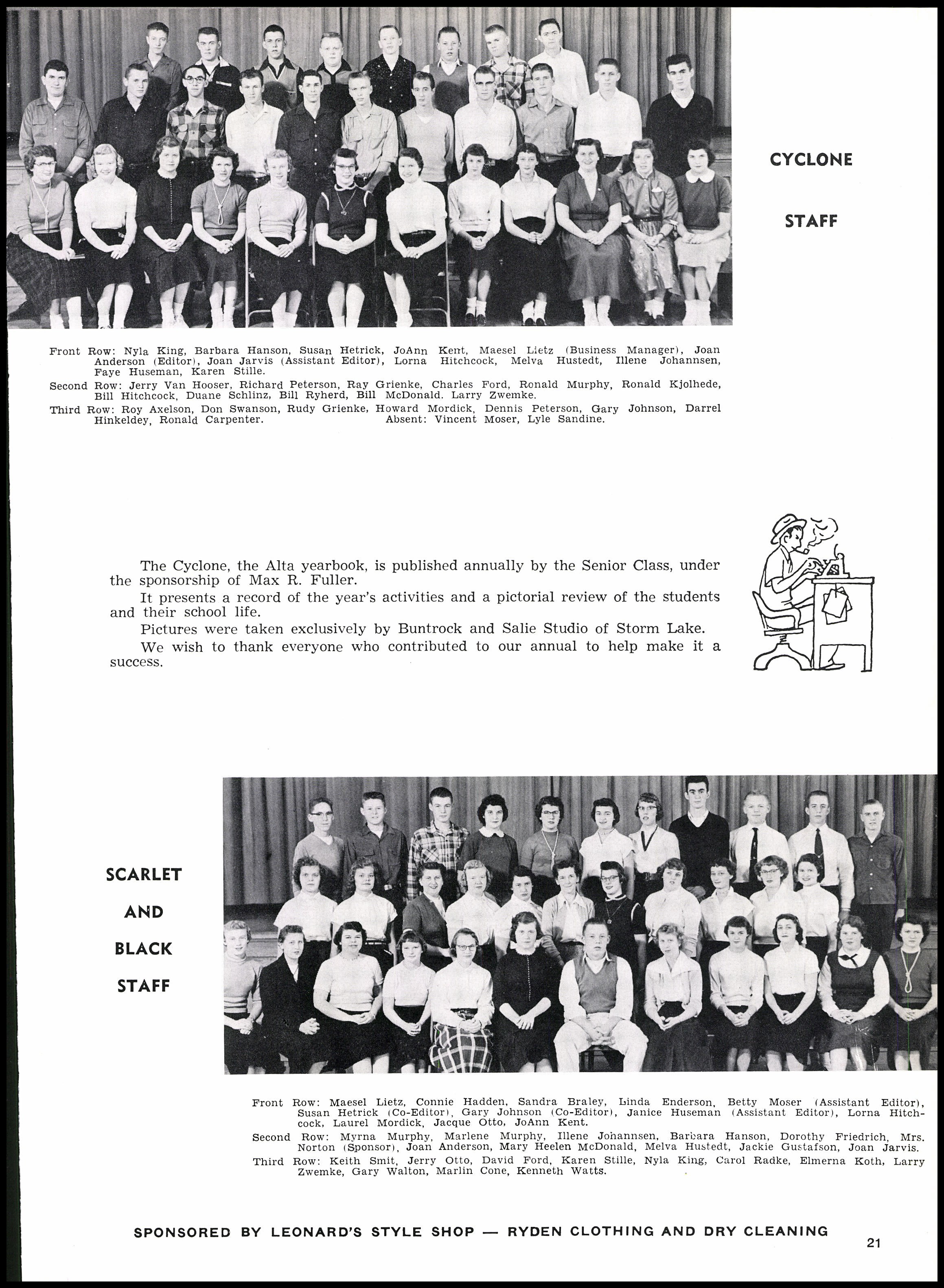 The Alta Community Library keeps one copy of the Alta community school(s) yearbooks on hand. These items are reference only, and may not be checked out. Our collection dates back to the Alta Community Schools Scarlet and Black 1944 edition, and we have most years up through the current Alta-Aurelia High School yearbook. In addition to physical copies, most of the yearbooks have been digitized, up through 2013.