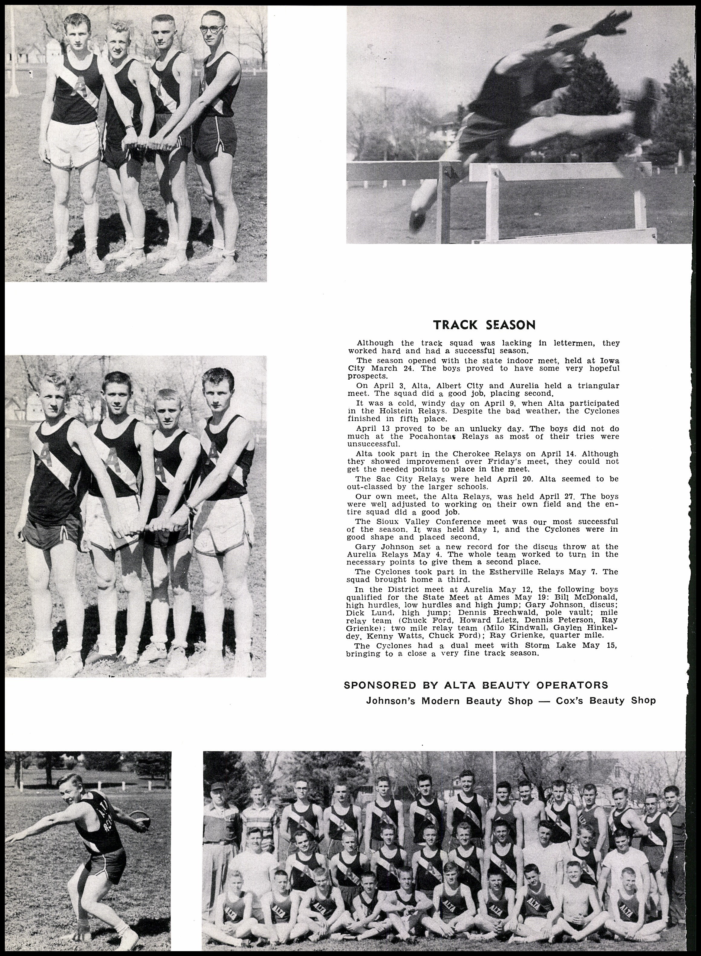 The Alta Community Library keeps one copy of the Alta community school(s) yearbooks on hand. These items are reference only, and may not be checked out. Our collection dates back to the Alta Community Schools Scarlet and Black 1944 edition, and we have most years up through the current Alta-Aurelia High School yearbook. In addition to physical copies, most of the yearbooks have been digitized, up through 2013.